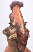 Comentario: Este boceto a color nos muestra un alienígena de gracioso aspecto pero gesto adusto cuyos rasgos más destacados son un enorme cráneo alargado rematado por un penacho de pelo y un largo mostacho que nace bajo la nariz y se une a una larga barba de chivo. Sus ojos son amarillos, con largas pestañas y enormes bolsas y tiene un pequeño tatuaje en su antebrazo derecho y una brillante gola dorada a la que se une lo que parece ser el comienzo de algún tipo de prenda.