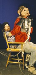 Comentario: En esta interesante imagen podemos ver, y no es nada habitual, como era y como se manejaba al "marioneta" que dio vida al piloto Ten Nunb. La marioneta tiene una tamaño similar al de un ser humano y representa solo la parte superior de su cuerpo ya que esta cortada de cintura para abajo. Un operario, recostado sobre una silla, usa sus brazos para dar vida a los de Nunb y el resto del modelo es animado por una serie de tubos y sirgas que salen de él y son operadas (suponemos) por otras personas.