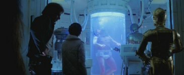 Texto: Luke Skywalker (Mark Hamill) sometido a un tratamiento de dormo-shock en el interior de una tanque de bacta monitorizado de cerca por un androide medico 2-1B.