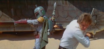Comentario: En la imagen podemos ver una de las muchas versiones que se hicieron del atuendo creado para Boba Fett. En dicha versión el casco tiene aun el logo de supercomando que ya vimos al comentar otro de los photoreceptores aunque lo que más nos interesa en esta ocasión es la capa. Se trata de un trozo de tela corto (no llega a las rodillas) que cuelga de su hombro izquierdo cubriendo todo el brazo y parte del pecho. La tela que es un color verde muy oscuro (casi negro) se ve muy desgastada y tiene varios agujeros. La idea de este aditamento, tal como descubre el titular y el texto era darle un toque de pistolero-forajido al más puro estilo del wester clásico lo cual resulta muy curioso puesto que en las precuelas vimos a su antecesor, Jango Fett, manejando la pistola blaster como si fuese el colt de un pistolero. Para terminar deciros que aunque la tela se conservó en la versión final del traje se optó por una tela menos raida también de color verde aunque, como vemos en la captura que os incluimos, en algunos planos se uso una a franjas ..¿Fallo de Racord?