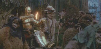 Comentario: En la foto vemos al shaman Ewok con su callado en la mano junto a C3PO que esta sentado en la silla sobre la que lo hará levitar Luke (ver captura de la película). El Androide, siguiendo el mandato de Luk, acaba de anunciar que es un dios muy poderoso pero Logray esta tan deseoso de cenarse a los humanos que tras una leve duda continua el ritual. Como ya sabemos Lulke tendrá que hacer volar al androide para que los Ewoks lo tomen en serio.