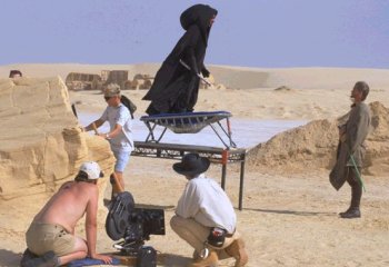 Comentario: Un miembro del equipo da de beber agua con una cañita al extra enfundado en el armazón de un androide de protocolo del tipo 3PO. En los reflejos de la carcasa del droide vemos los parasoles rojiblancos que utilizaba el equipo para protegerse del sol de Túnez.